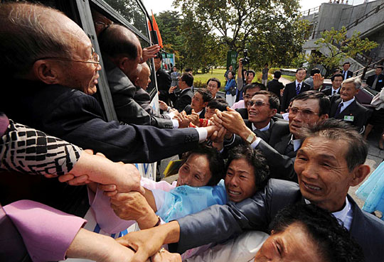 在朝鲜金刚山地区,朝方家属与坐在大巴车上即将离开的韩方亲人告别。