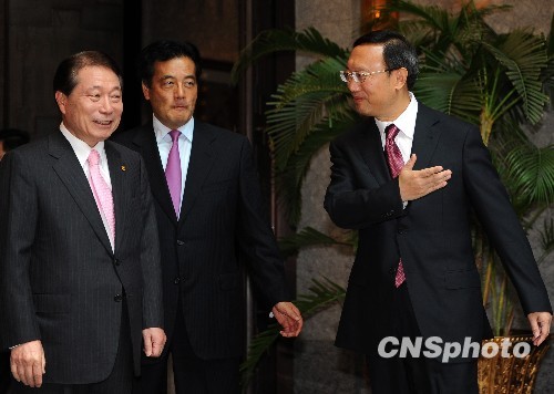 中国外交部长杨洁篪在上海西郊宾馆迎接日本外务大臣冈田克也(中)、韩国外交通商部长官柳明桓。中新社发 廖攀 摄