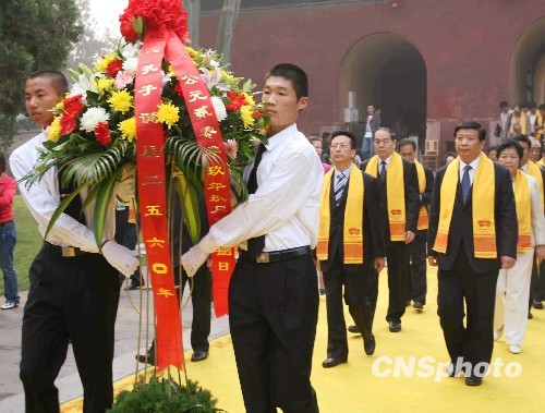 图为全国人大常委会副委员长陈昌智(第二排左)、山东省长姜大明(第二排右)向孔子敬献花篮。