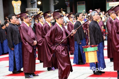 图为主导及掌控仪式的礼生首度由高中的年轻学子与资深礼生搭配共同执礼,象征儒家文化向下扎根与世代传承。