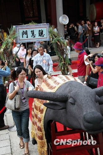 图为仪式结束后举办“礼仁门路出类拔萃”活动,重现传统古礼兼具鼓励学习之效,民众排队拔取“智慧牛”身上满布的2000支毛笔,冀望“耳聪目明、出类拔萃”。据指,自古牛毛有着增添智慧及考试顺利的象征。