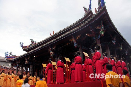 9月28日清晨,台北孔庙隆重举行孔子诞辰2559周年释奠典礼。在钟鼓乐声中,启扉、迎神、上香、献帛、献爵、献花、饮褔、受胙及送神等传统古礼依序进行,场面庄严。由初中生和小学生分别担任的乐生和佾生,展现雅乐、姿仪,表达对孔子的尊崇和赞颂。