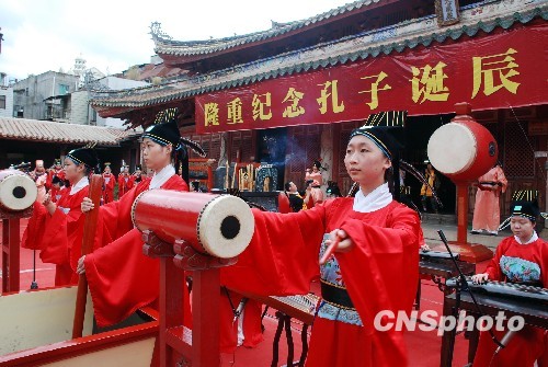 9月28日,侨乡福建泉州府文庙举行孔子诞辰2560周年祭祀大典。图为仿古祭孔仪式隆重、庄严。