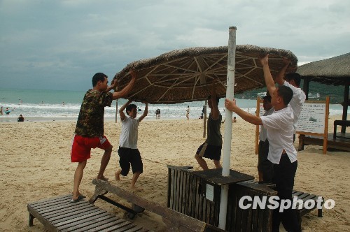9月28日,海南三亚大东海景区的工作人员正在转移设在沙滩上旅游设施。为防御今年第16号台风“凯萨娜”,三亚市各旅游景点景区涉海项目已全部关闭。中新社发 尹海明 摄
