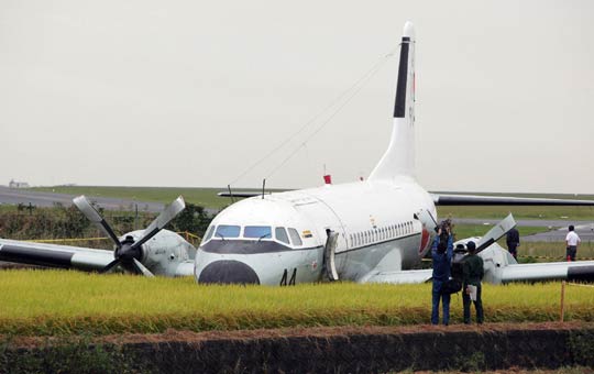 当地时间28日,位于日本山口县下关市的日本海上自卫队小月航空基地一架运输机在着陆时冲出跑道,闯入基地外的农田。