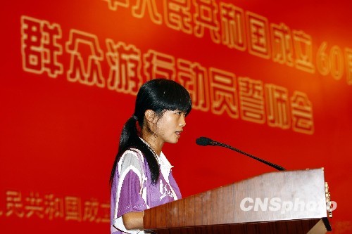图为誓师大会上清华学子代表激昂宣誓,保证出色完成国庆60周年庆祝活动任务。中新社发 郑雄增 摄