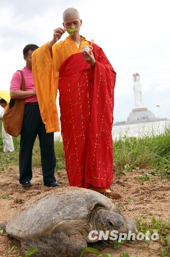 9月28日,海南三亚南山景区举行放生活动。10只重约百余斤的国家二级保护动物“玳瑁”海龟在南山108米南海观音脚下被放归大海。同时,2000只野鸟和100余尾灰蛇放归。图为法师为海龟洒净开示。中新社发 陈文武 摄