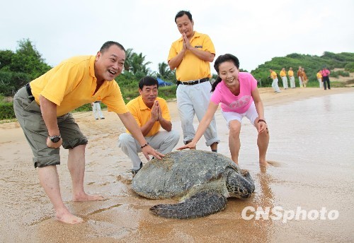 10只重百余斤的“玳瑁”海龟在三亚放生(2)