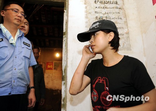 图为获救的女青年通过手机向家人报平安。中新社发 刘可耕 摄