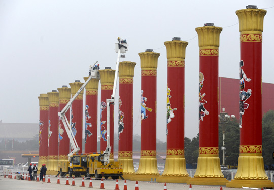 28日下午,天安门广场上的56根“民族团结柱”全部组装完成。图为工人们正在吊装“民族团结柱”上的零件。