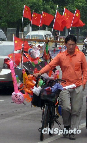图为国庆来临之际,素有“小联合国”之称的浙江义乌街头到处洋溢着节庆的气氛,流动的国旗小商贩更是随处可见。中新社发 朱丽珍 摄