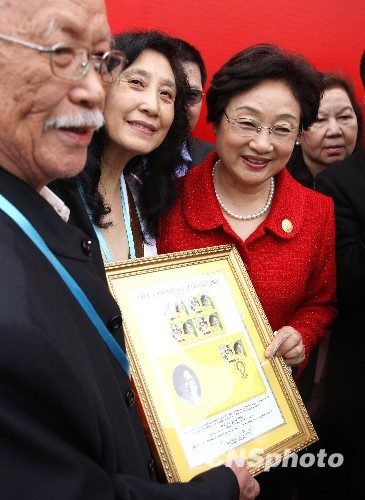 9月29日,中国中央涉侨单位在北京联合举办“庆祝中华人民共和国成立60周年招待会”,华侨华人代表向国务院侨办主任李海峰赠送纪念品。中新社发 杜洋 摄