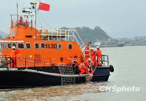 图为救助船只抛下救生圈,将落水的一名遭劫持客轮船员拉上船艇。中新社发 张丽君 摄