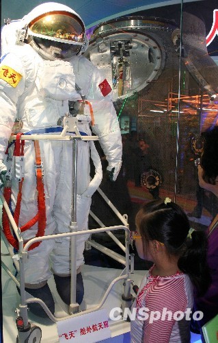 9月29日,“辉煌六十年——中华人民共和国成立六十周年成就展”继续在北京展览馆展出,科教单元展示的由中国自主研制并成功完成“神七”航天员太空出舱任务的“飞天”舱外航天服颇受关注。中新社发 孙自法 摄