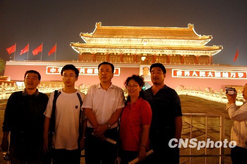 北京天安门广场在国庆庆典前各地游客合影留念。中新社发 许康平 摄