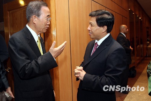 图为张业遂大使欢迎潘基文。中新社发 孙宇挺 摄