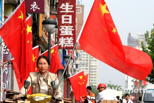 江苏泰州市区街道张灯结彩,国旗飘飘,迎接新中国六十华诞的到来。中新社发 顾祥忠 摄