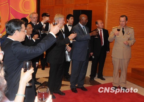 中国驻美大使馆二十九日晚举行庆祝中华人民共和国成立六十周年招待会,多名美国政要及美国各界友好人士近一千人到现场道贺,赞新中国六十年成就,倡中美继续友好合作。前排举杯者分别为美国参谋长联席会议主席马伦(右一)、美国贸易代表让·科克(右二)、美国国务院助理国务卿霍马茨(右三)、中国驻美大使周文重(右四)等在招待会上举杯祝贺。中新社发 吴庆才 摄