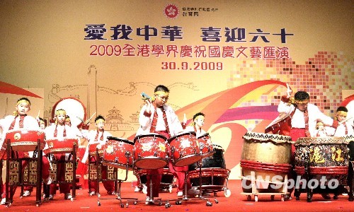 九月三十日,香港举办“爱我中华 喜迎六十”2009全港学界庆祝国庆文艺汇演。四百多名来自全港中小学和幼稚园的学生表演舞蹈、管乐鼓乐等精彩节目。图为香港小学生表演鼓乐雷鸣庆欢腾。中新社发 张勤 摄