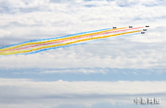 10月1日,首都各界庆祝中华人民共和国成立60周年大会在北京举行。图为教练机编队经过。中新网记者 金硕 摄