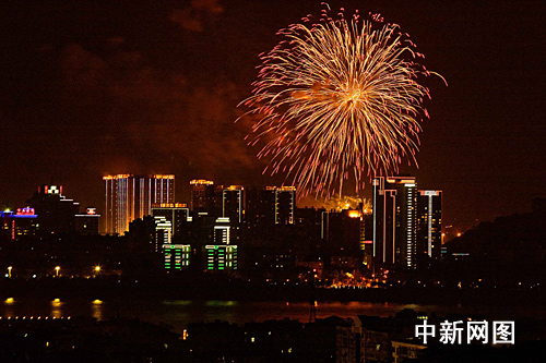 长江之中烟火美轮美奂。 王彬摄