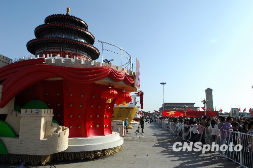 10月2日下午,北京天安门广场对公众开放,展示参加国庆60周年庆典群众游行方阵中的彩车,吸引大量游客参观。中新社发 侯宇 摄