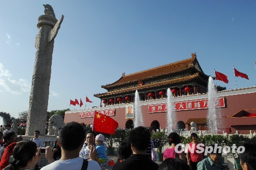 10月2日下午,经历了1日的大阅兵和联欢晚会后,普通百姓蜂拥至天安门城楼前和天安门广场,凸显“十一”黄金周旅游高峰氛围。中新社发 侯宇 摄