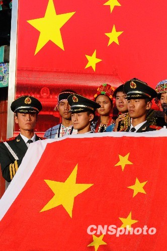 10月2日下午,国旗护卫队在北京接受“中华各民族青少年同心营”成员亲手绣制的一面五星红旗。中新社发 侯宇 摄