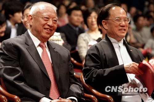 十月二日晚,香港同胞庆祝中华人民共和国成立六十周年文艺晚会在香港举行。图为全国政协副主席董建华、香港特区行政长官曾荫权出席晚会。中新社发 张勤 摄