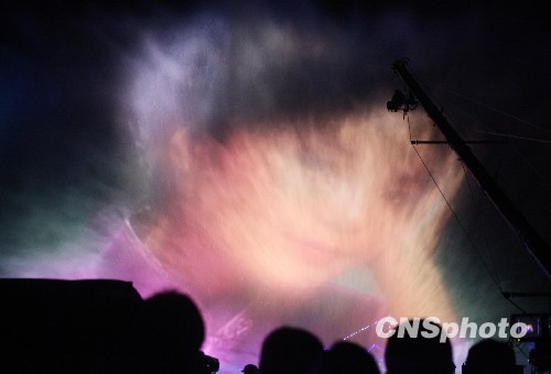 10月2日晚,日月潭畔举行的“二00九妈祖之光”大型晚会上,薄薄水幕上映出一代歌后邓丽君的头像,伴随着她《水调歌头》中“明月几时有,千里共婵娟”的吟唱,引发全场强烈共鸣。中新社发 李佳佳 摄