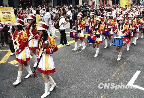 十月三日下午,香港各界青少年庆祝中华人民共和国成立60周年万人大巡游活动举行,全港超过一万名青少年参加了活动。中新社发 张勤 摄
