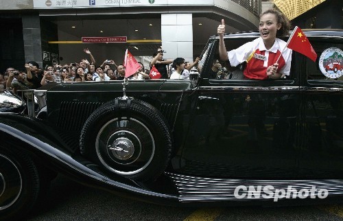 图为香港艺人容祖儿参加巡游贺国庆。中新社发 张勤 摄