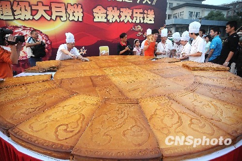 10月3日,中秋节,一个直径3米、重约1吨的超级大月饼出现在杭州运河广场,并将现场把制作完成的月饼赠送杭州市民。 中新社发 引炜 摄