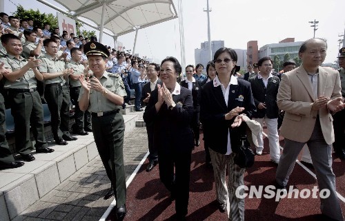 十月四日,由香港工商界、演艺界人士等组成的香港各界中秋探访团,在董赵洪娉女士和曾鲍笑薇女士的率领下来到驻军昂船洲军营慰问。图为驻军政治委员刘良凯中将与董赵洪娉女士和曾鲍笑薇女士进入会场。