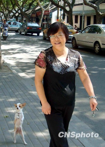 2009年10月4日,苏州平江区姚女士饲养的小狗陪着主人用“双脚”散步。据介绍,这只经过训练的宠物狗,一次可陪主人“步行”数百米。