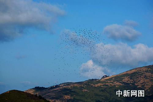 中新网宜昌10月6日电(刘良伟 罗永斌)5日,数百只鸟组成的巨大鸟群出现在神农架神农顶景区的凉风垭一带空中,让在此游览的游客大饱眼福。