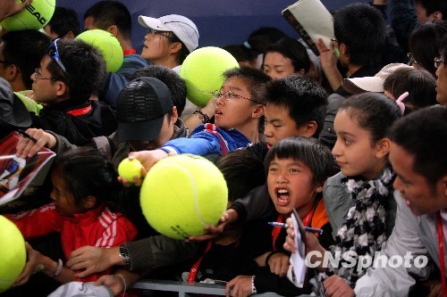 众多小球迷挤到看台前争相要纳达尔签名。中新社发 刘震 摄
