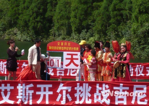 图为太姥山景区负责人与艾斯开尔共同揭开挑战吉尼斯世界纪录计时牌,拉开此次高空生存的序幕。中新社发 郑晓冲 摄