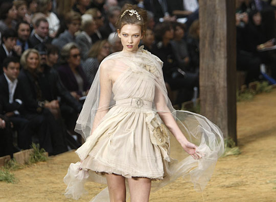 图为模特在法国巴黎展示德国设计师卡尔·拉格费尔德为香奈儿(Chanel)设计的春夏新品。