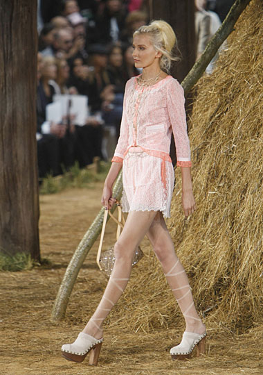 图为模特在法国巴黎展示德国设计师卡尔·拉格费尔德为香奈儿(Chanel)设计的春夏新品。