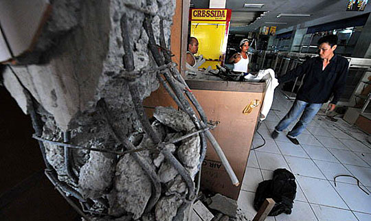 图为一家商铺的雇员从在地震中毁坏的房屋里捡拾有用的物品。