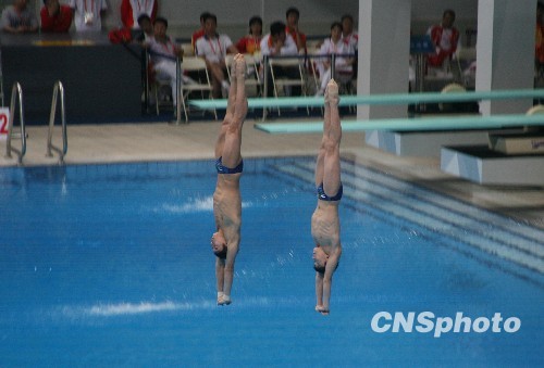 十月八日晚,在山东省城济南奥体中心游泳馆内举行的中国第十一届运动会跳水男子双人十米台决赛中,来自北京队的林跃与曹缘凭借默契的配合和完美的动作,力挫群雄,以四九七点六一的高分问鼎男子双人十米台。