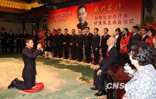 图为来自台湾国光剧团的演员盛监向叶蓬教授行拜师礼。中新社发 王丽南 摄