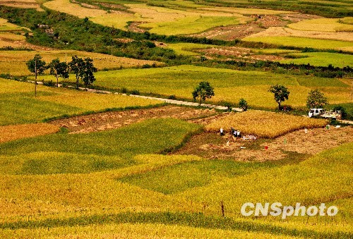 10月8日,婺源县栗木坑村稻田一片金黄。眼下正值秋收季节,江西省婺源县农村各地稻谷成熟,村落与田野间呈现出一幅幅美丽的秋收画卷。
