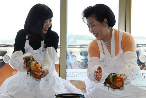 2009年10月9日,韩国第一夫人金润玉和到访的日本首相夫人鸠山幸当日上午在首尔的韩国传统饮食研究所一起做泡菜。