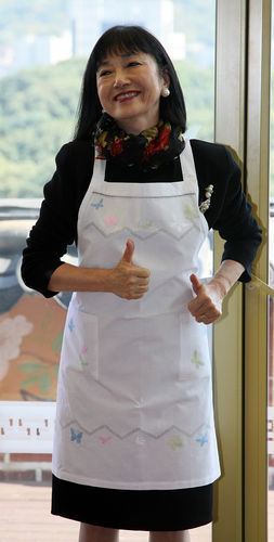 2009年10月9日,日本首相夫人鸠山幸在首尔的韩国传统饮食研究所做泡菜。