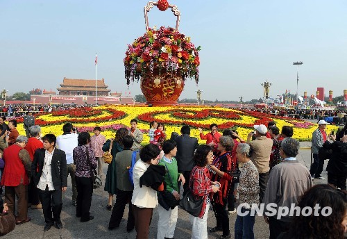 2009年10月9日,虽然“十一”黄金周已经结束,但北京天安门广场仍然游人如织,依然延续黄金周旅游的火爆场面。中新社发 王志德 摄