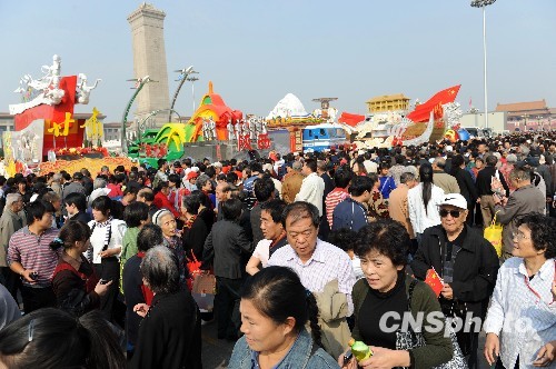 虽然“十一”黄金周已经结束,但北京天安门广场仍然游人如织,依然延续黄金周旅游的火爆场面。中新社发 王志德 摄