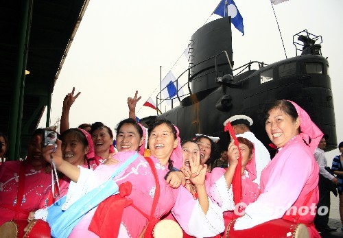 图为武汉市民敲起腰鼓欢迎潜艇“安家”武汉。中新社发 张畅 摄