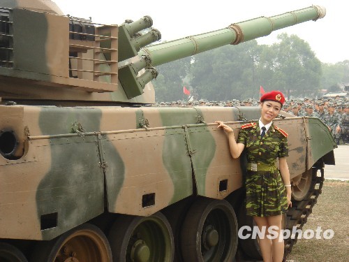 图为当地文艺工作者在驻桂部队的坦克前拍照。中新社发 欧惠兰 摄